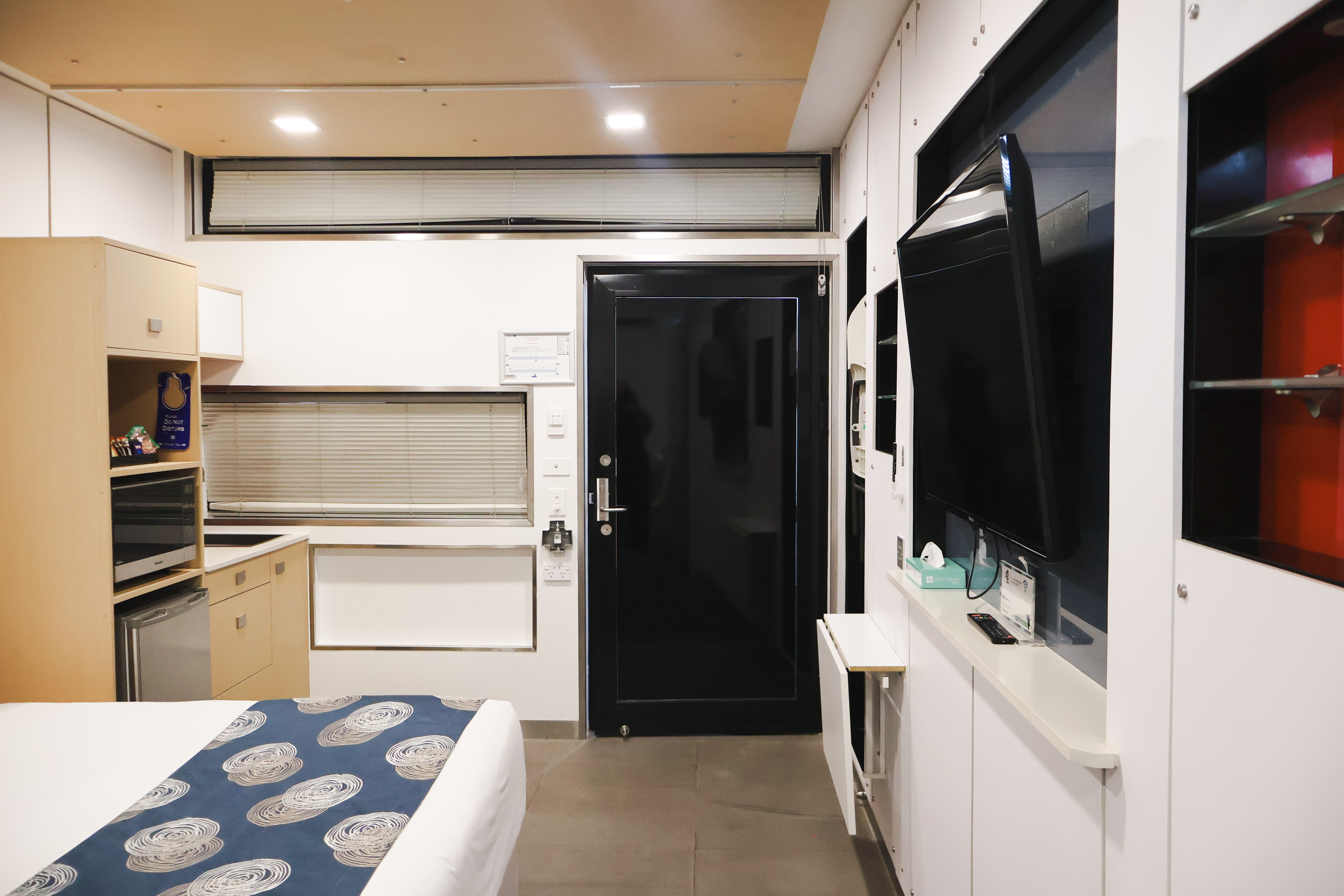 The kitchenette is fully equipped with a mini refrigerator, microwave, kettle, toaster, and kitchenware — ideal for preparing light meals or snacks.